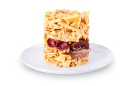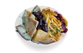 BATATA FRITA COM ISCAS DE CARNE BOVINA, CALABRESA, BACON, LINGUIÇA E AMERICAN CHEESE (APROX. 1,5KG)