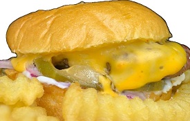 PÃO SELADO, MAIONESE ARTESANAL DOM CAETANO, BURGER ARTESANAL BOVINO 120G, QUEIJO CHEDDAR FATIADO, CEBOLA ROXA E PICLES