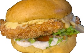 PÃO SELADO, MAIONESE ARTESANAL DOM CAETANO, 150G DE PEITO DE FRANGO EMPANADO, AMERICAN CHEESE, ALFACE E TOMATE