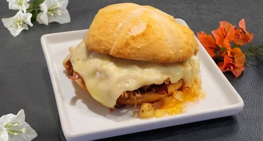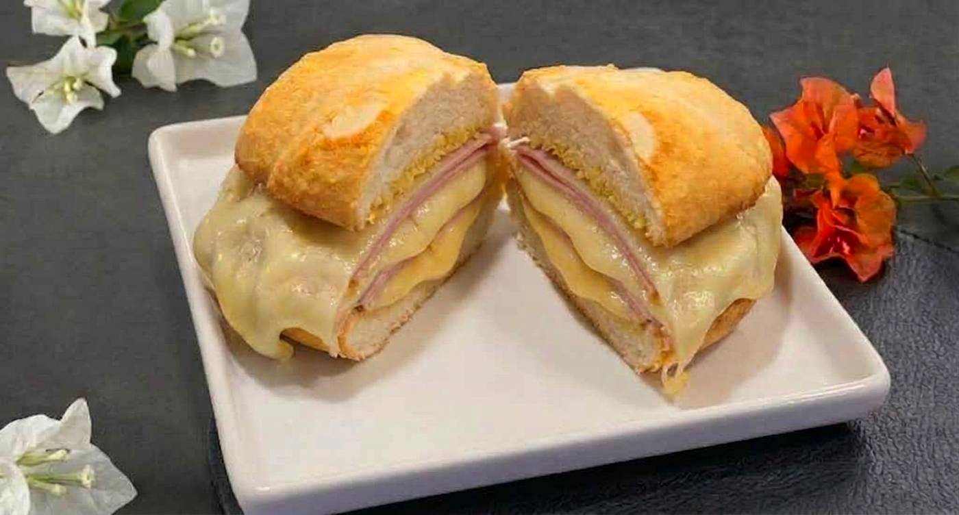 Pão d'água tostado na manteiga, com queijo mussarela, presunto e maionese defumada..