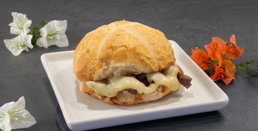 Sanduiche tostado na manteiga com tiras de alcatra feitas na chapa, queijo mussarela e maionese.