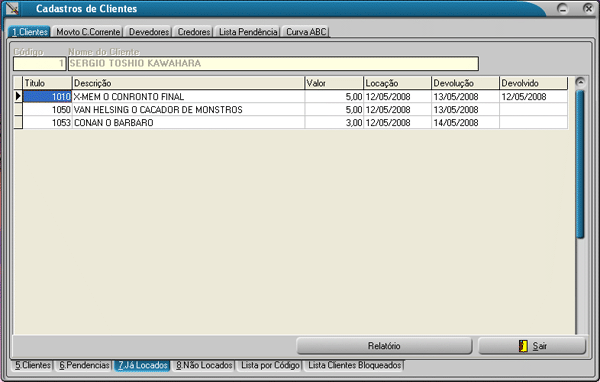 Nesta tela será mostrado todos os titulos que já forão locados pelo Cliente os já devolvidos e os pendentes, para acessar o cadastro dos já locados, vá para a tela principal do sistema, no módulo de cadastros(Alt + C) e selecione Clientes e clique na aba Já Locados ou (ALT + 7), passe o mouse sobre os campos que deseja informações.