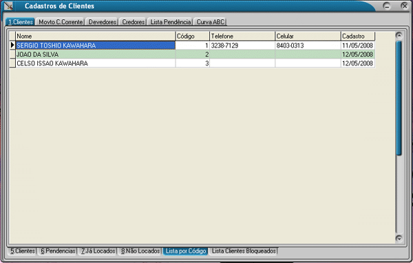 Nesta tela será mostrado todos os Clientes em ordem por código essa informação é importante para se verificar a sequencia dos códigos, para acessar a Lista por Código, vá para a tela principal do sistema, no módulo de cadastros(Alt + C) e selecione Clientes e clique na aba Lista por Código, passe o mouse sobre os campos que deseja informações.