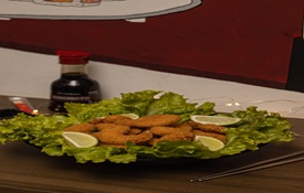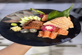GOHAN (ARROZ JAPONES), SUNOMONO (PEPINO AGRIDOCE), RASPAS DE LIMAO SICILIANO, 25 GRAMAS DE CAMARÃO EMPANADO, 100 GRAMAS DE SALMÃO GRELHADO, ALFACE AMERICANA, GENGIBRE PICADO, MANGA E MOLHO SENNIN.