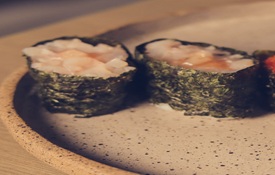 TILAPIA MARINADA NO LIMÃO, ARROZ ENVOLTO NA ALGA NORI, FINALIZADO COM WASABI E GELEIA DE PIMENTA.